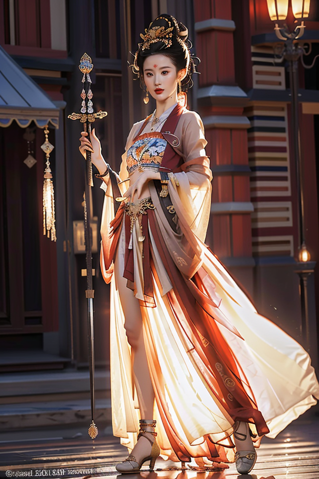 CR1.3,(flirtatious ,seductive:1.4),(RAW photo:1.2),(photorealistic:1.6),(lens 135mm,f1.8:1.2),(ultimate quality, masterpiece:1.3),(intricate details:1.2),(detailed face:1.2),dramatic,ray tracing,fashion photograph,<lora:goodhands_Beta_Gtonero:0.5:lbw=HAND>,good hands,Fixhand,fFaceDetail,Full body,Sharp focus,cinematic lighting, <lora:dunhuangV3:1:lbw=CLOTHING>,(floating clothes,thighs,dunhuang cloths,hanfu,waist cape,strapless,navel,robe:1.2), <lora:å亦è²liuyifei:0.8:lbw=FACE>,liuyifei,, <lora:UnlimitedBladeWorks1.6-Lycoris:0.5:lbw=ACT>,Unlimited Blade Works,holding weapon,<lora:ChineseweaponsV2:0.3>,å,ä¸å½å µå¨, <lora:Chinesestyle_swordswoman:0.8:lbw=ACT>,Chinese style,(holding sword,sword, fighting stance:1.6),, (1girl,solo,outdoors,war castle:1.6),confident smile,beautful face,<lora:PerfectBreastsV4-offset:0.5:lbw=BODY>,(large breasts, narrow waist:1.2),sexy body,perfect body,shiny hairs,<lora:zanhua_v1:0.65>,zanhua,hair ornament,earrings,necklace,jewelry, (anatomically correct hands,anatomically correct feet,anatomically correct body:1.6),