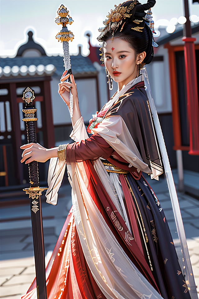 CR1.3,(flirtatious ,seductive:1.4),(RAW photo:1.2),(photorealistic:1.6),(lens 135mm,f1.8:1.2),(ultimate quality, masterpiece:1.3),(intricate details:1.2),(detailed face:1.2),dramatic,ray tracing,fashion photograph,<lora:goodhands_Beta_Gtonero:0.5:lbw=HAND>,good hands,Fixhand,fFaceDetail,Full body,Sharp focus,cinematic lighting, <lora:dunhuangV3:1:lbw=CLOTHING>,(floating clothes,thighs,dunhuang cloths,hanfu,waist cape,strapless,navel,robe:1.2), <lora:å亦è²liuyifei:0.8:lbw=FACE>,liuyifei,, <lora:UnlimitedBladeWorks1.6-Lycoris:0.5:lbw=ACT>,Unlimited Blade Works,holding weapon,<lora:ChineseweaponsV2:0.3>,å,ä¸å½å µå¨, <lora:xuer Ancient Chinese sword(No filter):0.8:lbw=ACT>,(xuer Ancient Chinese sword,swordsman:1.2),(holding sword,sword, fighting stance:1.6),, (1girl,solo,outdoors,war castle:1.6),confident smile,beautful face,<lora:PerfectBreastsV4-offset:0.5:lbw=BODY>,(large breasts, narrow waist:1.2),sexy body,perfect body,shiny hairs,<lora:zanhua_v1:0.65>,zanhua,hair ornament,earrings,necklace,jewelry, (anatomically correct hands,anatomically correct feet,anatomically correct body:1.6),