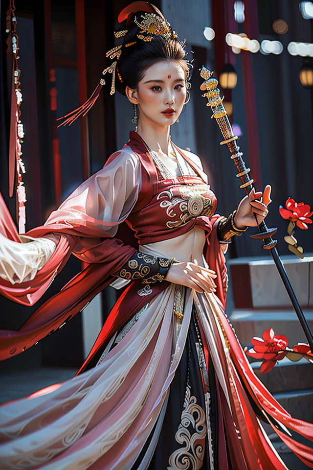 CR1.3,(flirtatious ,seductive:1.4),(RAW photo:1.2),(photorealistic:1.6),(lens 135mm,f1.8:1.2),(ultimate quality, masterpiece:1.3),(intricate details:1.2),(detailed face:1.2),dramatic,ray tracing,fashion photograph,<lora:goodhands_Beta_Gtonero:0.5:lbw=HAND>,good hands,Fixhand,fFaceDetail,Full body,Sharp focus,cinematic lighting, <lora:dunhuangV3:1:lbw=CLOTHING>,(floating clothes,thighs,dunhuang cloths,hanfu,waist cape,strapless,navel,robe:1.2), <lora:åè©©è©©llfliushishi:0.8:lbw=FACE>,, <lora:UnlimitedBladeWorks1.6-Lycoris:0.5:lbw=ACT>,Unlimited Blade Works,holding weapon,<lora:ChineseweaponsV2:0.3>,å,ä¸å½å µå¨, <lora:xuer Ancient Chinese sword(No filter):0.8:lbw=ACT>,(xuer Ancient Chinese sword,swordsman:1.2),(holding sword,sword, fighting stance:1.6),, (1girl,solo,outdoors,war castle:1.6),confident smile,beautful face,<lora:PerfectBreastsV4-offset:0.5:lbw=BODY>,(large breasts, narrow waist:1.2),sexy body,perfect body,shiny hairs,<lora:zanhua_v1:0.65>,zanhua,hair ornament,earrings,necklace,jewelry, (anatomically correct hands,anatomically correct feet,anatomically correct body:1.6),