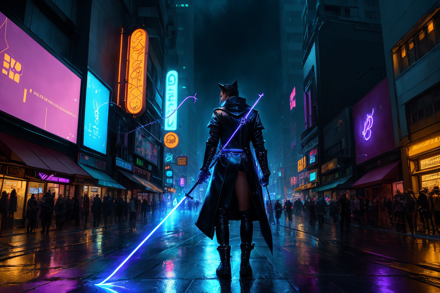 A magical catboy with a staff casting a spell on a busy city street at night, neon lights, rainy, cyberpunk, futuristic, digital art, highly detailed, intricate, sharp focus, trending on Artstation, by andrei riabovitchev and jonathan ravasz and beata durczok