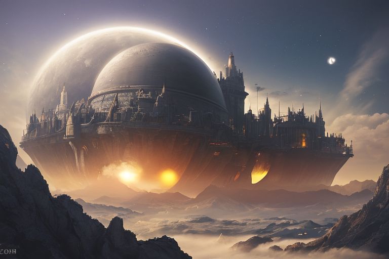 Photograph an ancient, floating fortress hovering above the colorful, swirling clouds of a gas giant planet. The fortress is built with dark, metallic structures and glowing runes, illuminated by the light of two suns—one red and one yellow.