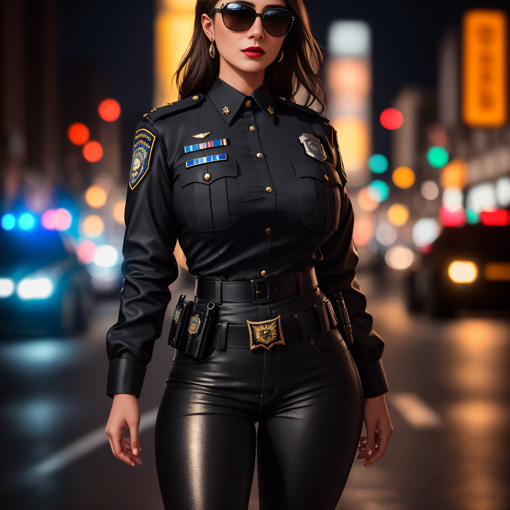 Masterpiece, high quality, 4K, beautiful design, shiny, from the front, award winning photo, extremely detailed, amazing, fine detail, absurdres, highly detailed woman, extremely detailed eyes and face, by lee jeffries nikon d850 film stock photograph 4 kodak portra 400 camera f1.6 lens rich colors hyper realistic lifelike texture dramatic lighting unrealengine trending on artstation cinestill 800 tungsten, <lora:Police_Woman:0.95>, (sexypolice, a woman in a police uniform posing for a picture, wearing sunglasses, heels, black jeans ,wearing a sexypolice outfit, police insignia, lipstick:1.125), city lights background,