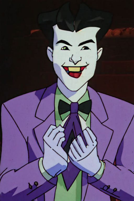 batman adventures, 1boy, joker, hat, bow, solo, male focus, jacket, bowtie, gloves, smile, shirt, purple bow, black background, purple jacket, upper body, long sleeves, green shirt, purple headwear, parody, purple bowtie, grin, purple shirt, simple background, suit, open mouth, formal, holding, black eyes, ((masterpiece)) <lora:batman_adventures_offset:1>