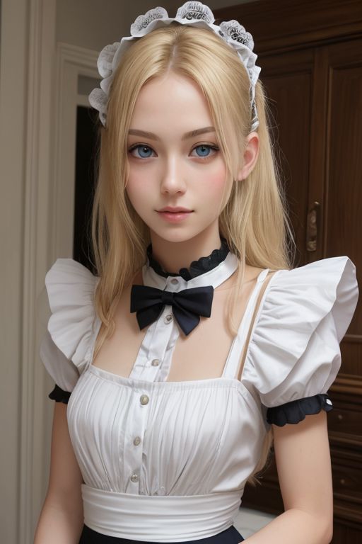 wide-angle shot, (1girl, 18y, young, short, cute, beautiful face, long blonde hair, blue eyes, light tan skin, small breasts), french maid