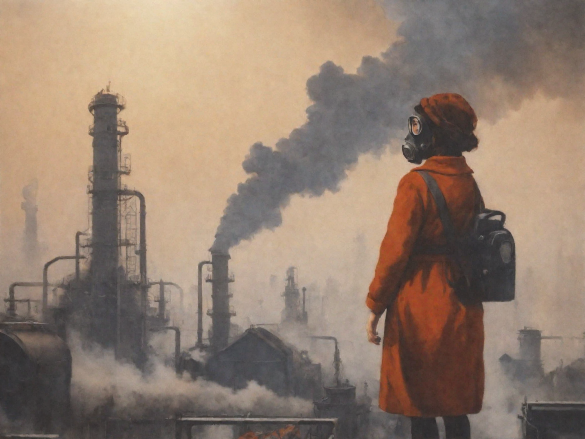 a girl in the gas mask, indistrial factory producing emissions, smoke plumes, fog, cityscape, ch, illustration, <lora:IllustrationStyle=chahua:0.75>, <lora:Soviet-poster:0.75>