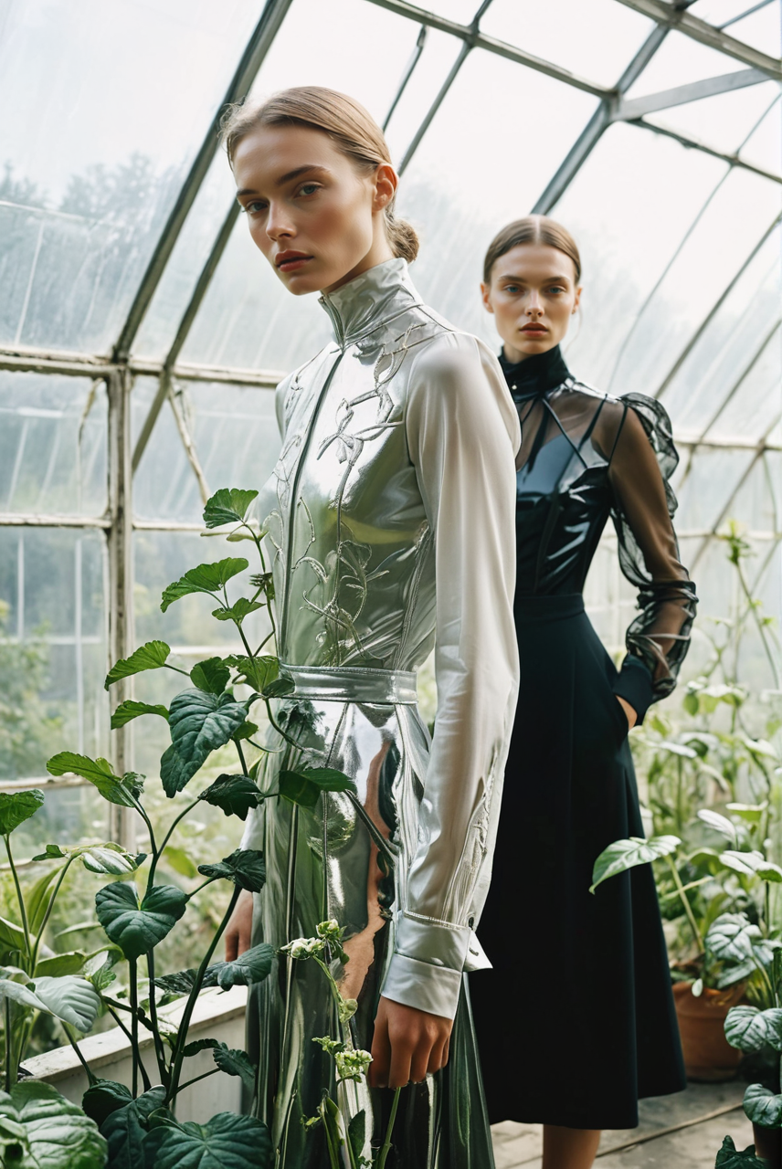 two woman standing in a greenhouse with a plant in the background and a large window in the background with a skylight, Claire Hummel, vines, a still life, aestheticism <lora:MJ52:0.65><lora:Fine art photography style:0.45> Fine art photography style <lora:SDS_Contrast tool_XL:1> <lora:add-detail-xl:1>