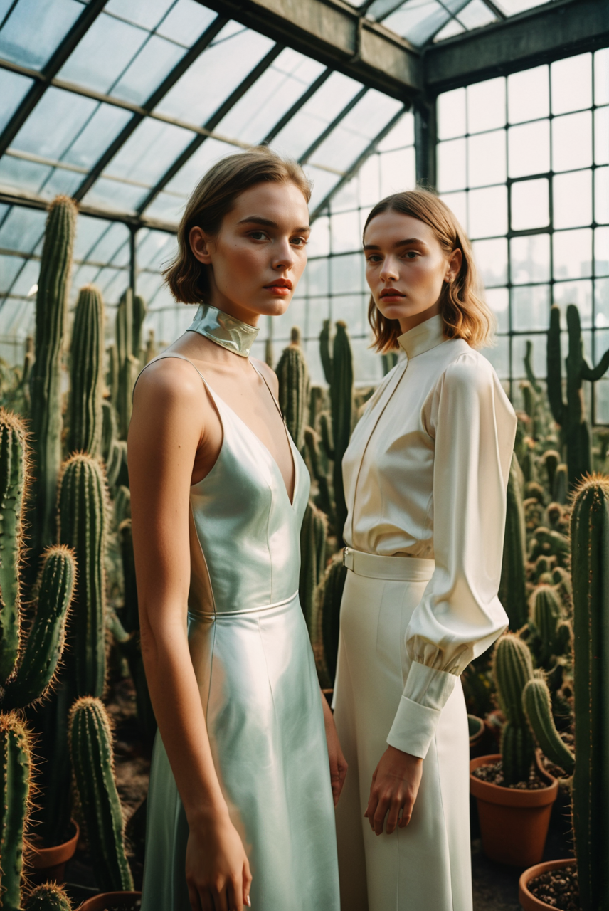 two young women standing next to each other near a cactus plant in a greenhouse with a cactus behind them, Chen Jiru, stunning visuals, a renaissance painting, aestheticism <lora:MJ52:0.45><lora:Fine art photography style:0.45> Fine art photography style <lora:SDS_Contrast tool_XL:1> <lora:add-detail-xl:1>