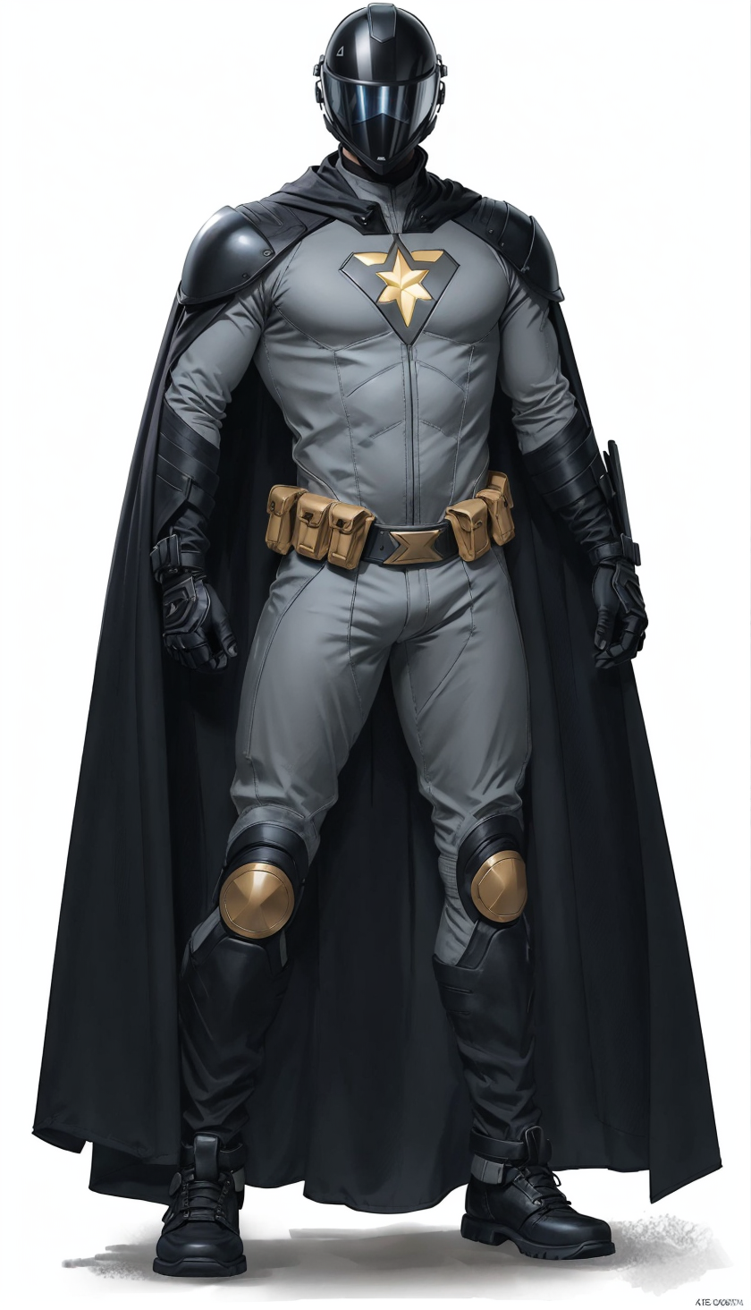 (male superhero:1.2), (sleek padded bodysuit superhero costume:1.2), (silver cape:1.3), (gargoyle symbol on chest:1.4), (motorcycle helmet with a large black visor:1.4), black utility belt, cape on his shoulders, built in armor pad costume, Altichiero, official art, concept art, (from_bellow:1.3), (a character portrait:1.1), analog style, (best hands:1.2), (full body shot:1.2), comic cover art, concept art, realistic character concept, realism, character design, concept art, character portrait, masterpiece, detailed face, trending on ArtStation, trending on CGSociety, Intricate, High Detail, Sharp focus, dramatic, high resolution, <lora:Rogue-fC-V1:1> bodysuit, blue bodysuit, rogue,