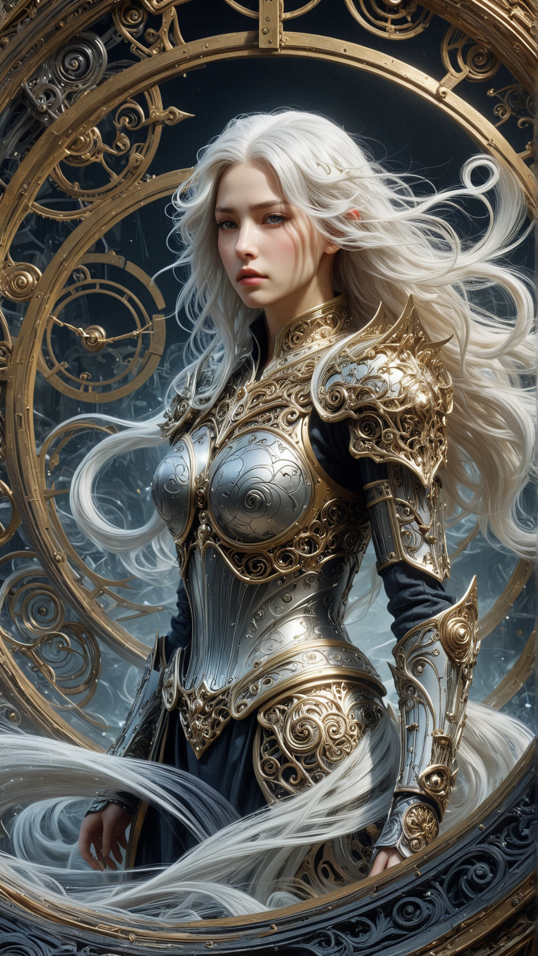 <lora:ElementWindSDXL:1>ElementWind Surrealist oil painting, Antique gold pocket watch with ornate engravings, Ticking, Set against a backdrop of a labyrinth of mirrors reflecting different realities, Dark and moody, Chiaroscuro lighting, Realistic details, Intricate mirror maze, Multiple reflections, Shattered glass, Dust and decay, High contrast, Vintage atmosphere, Dramatic shadows, Rusted metal, Aged patina, Rough texture, Abstract shapes, Dreamlike, Timeless, Nostalgic, Melancholic,a drawing of a woman with long white hair, wearing ornate armor, a character portrait by yoshitaka amano, featured on pixiv, fantasy art, official art, androgynous, anime wind, blowing ethereal streaks, gusts of wind, (Masterpiece:1.3) (best quality:1.2) (high quality:1.1)