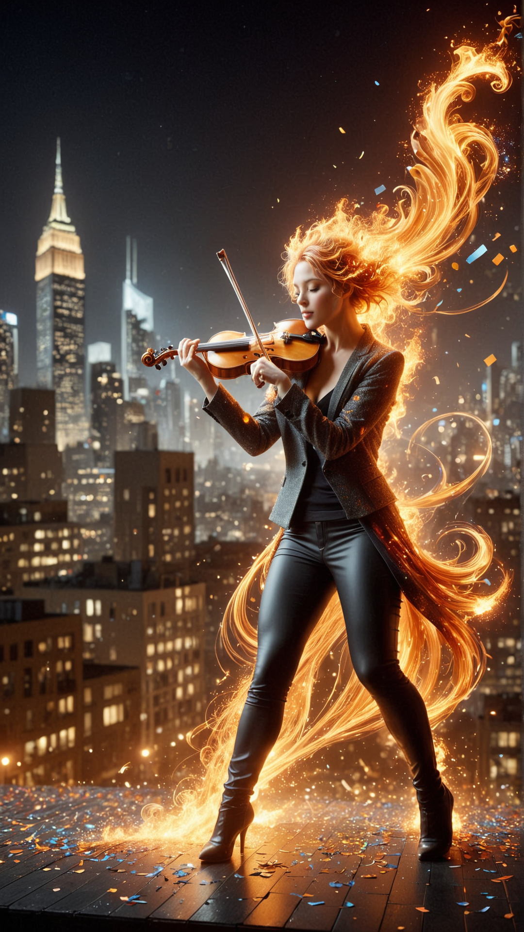 <lora:ElementFireSDXL:1>ElementFire Orange Urban, Night, Rooftop, Solitary violinist, Playing violin, City skyline, Explosion of confetti, Festive atmosphere, Colored confetti, Twinkling city lights, Reflection of city lights, Vibrant colors, Dynamic pose, Excited expression, High contrast, Sharp focus, High quality, Glossy finish,cube flames, burning fire, blazing, (Masterpiece:1.3) (best quality:1.2) (high quality:1.1)