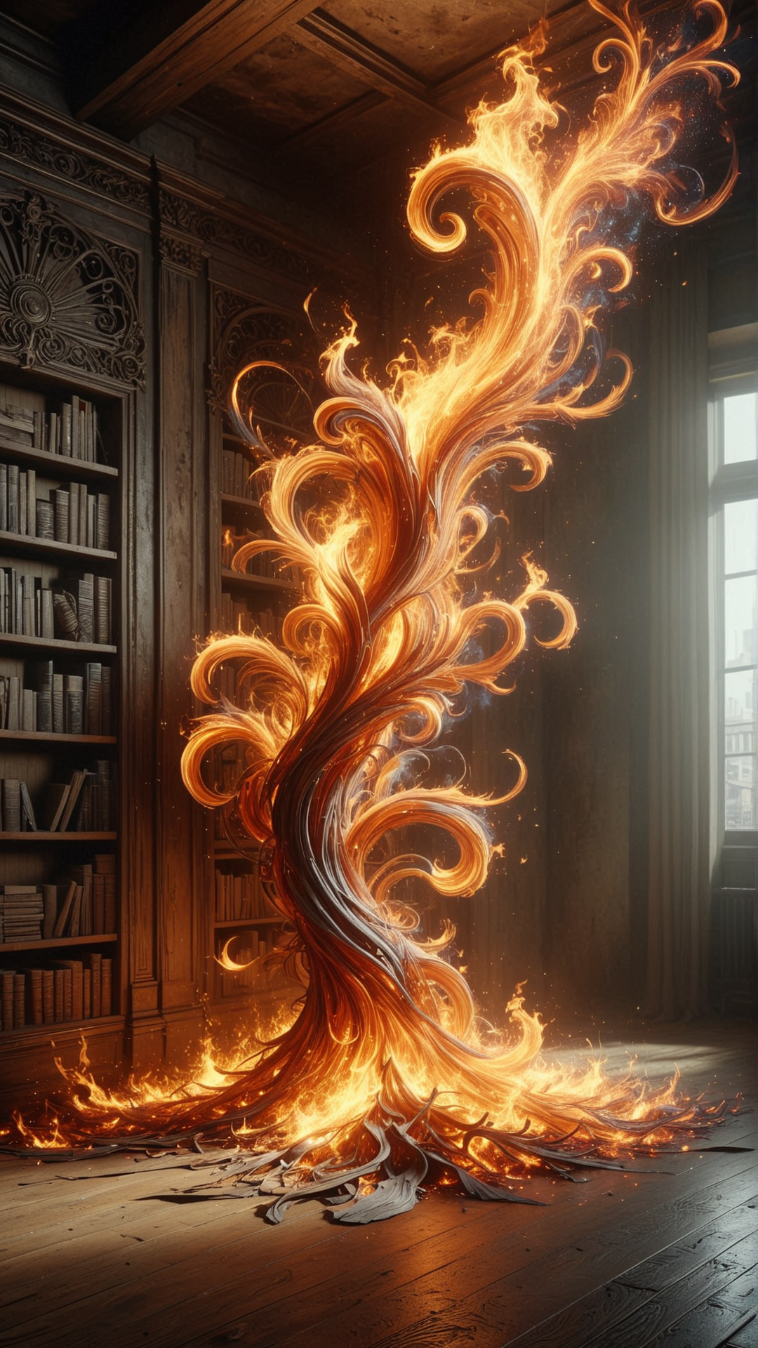 <lora:ElementFireSDXL:1>ElementFire Orange the streets of post apocalyptic barcelona covered in wild vegetation, raining, trending on artstation, photorealistic, ultra detailed, high definition, moody, depth of field,Realistic oil painting of shadows dancing in a dusty old library, warm lighting, dust particles, old books, wooden shelves, tall windows, ornate ceiling, atmosphere of mystery and forgotten knowledge, muted colors, chiaroscuro, vanishing point perspective, detailed and textured, high resolution, art print, wall art, large format flames, burning fire, blazing, (Masterpiece:1.3) (best quality:1.2) (high quality:1.1)