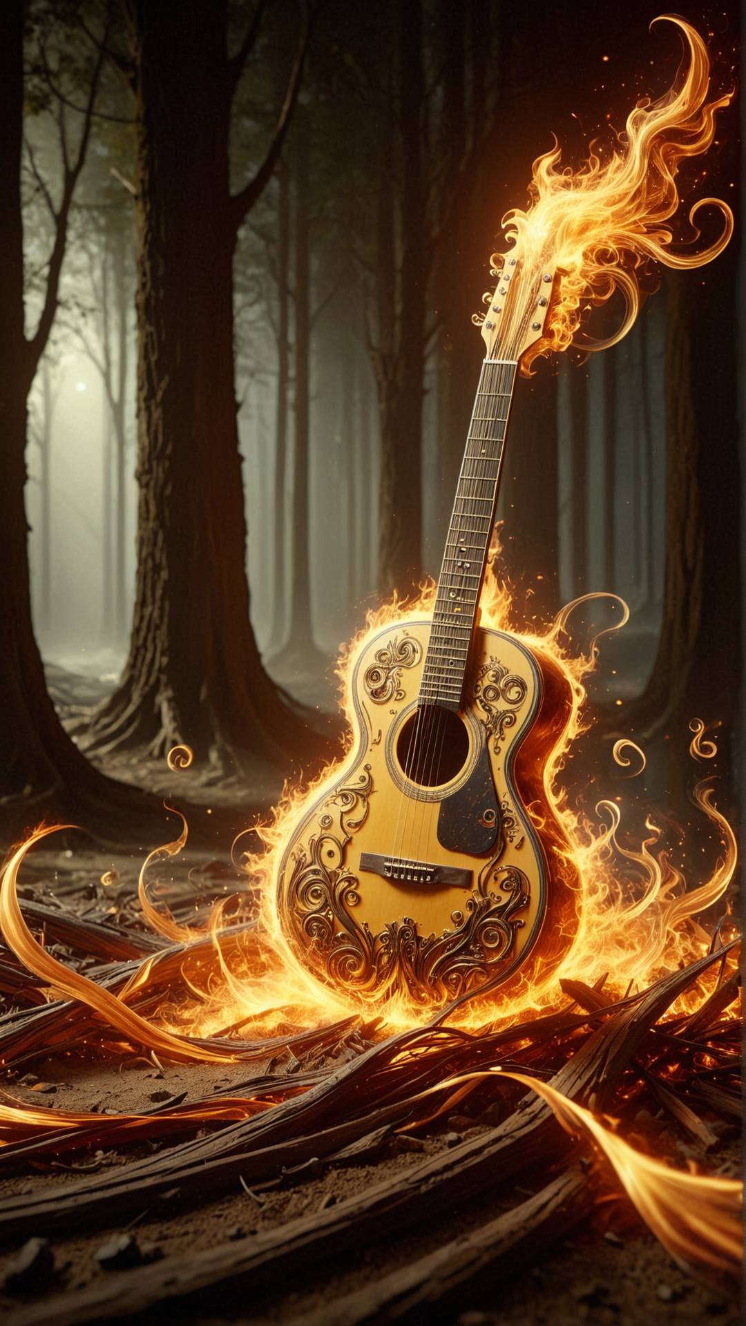 <lora:ElementFireSDXL:1>ElementFire Yellow Guitar string winder,digital painting, wind, secrets, forgotten lives, surreal, dreamlike, moonlit forest, orchestra of crickets, golden sand, lost city, adventure, mystery, drama, vibrant colors, dynamic, intricate, detailed, concept art, artstation, wallpaper, illustration, wide angle, artbook, promo art, dramatic lighting flames, burning fire, blazing, (Masterpiece:1.3) (best quality:1.2) (high quality:1.1)