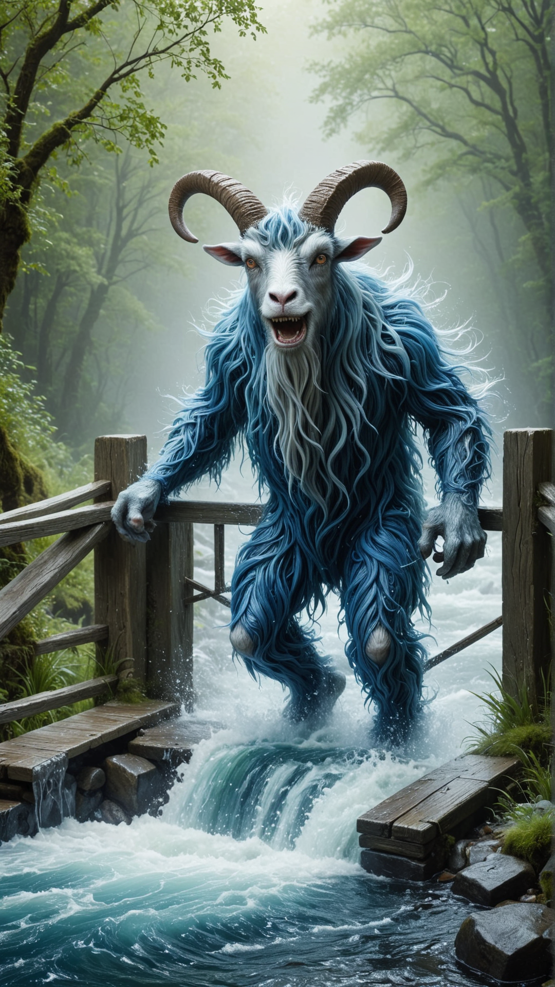 <lora:ElementWaterSDXL:1>ElementWater the three billy goats gruff trying to cross the bridge guarded by a troll, water, swirling, splash