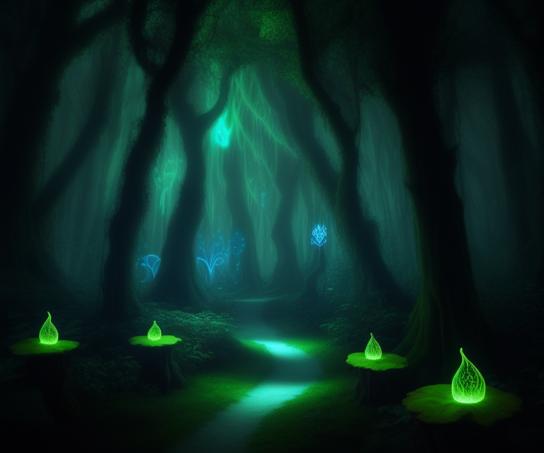 enchanted forest with bioluminescent plants and mystical creatures