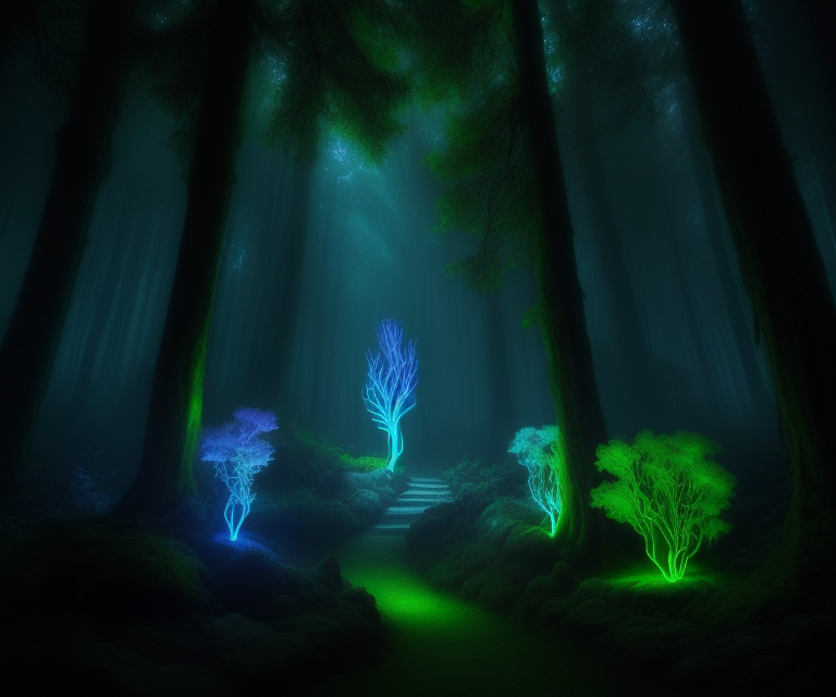 enchanted forest with bioluminescent plants and mystical creatures