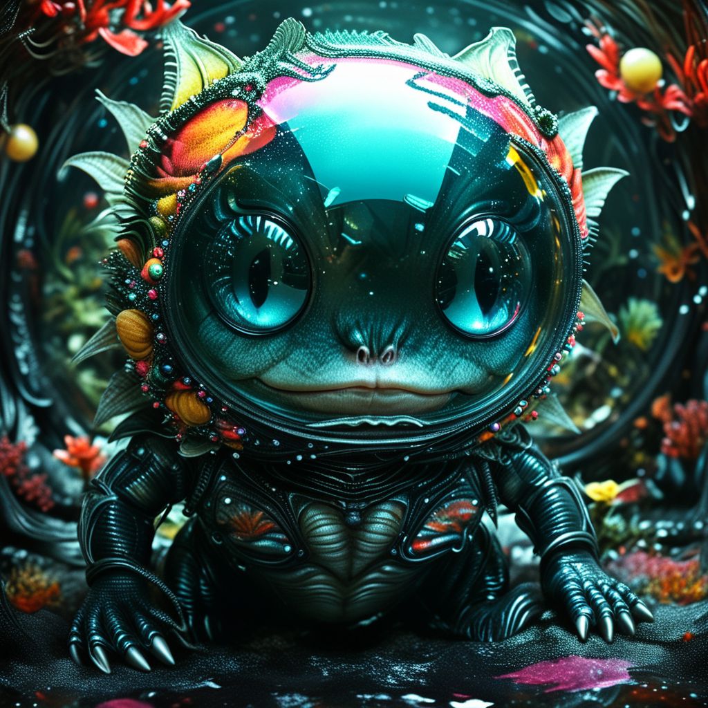 A cute space creature reminiscent of Dr. Guess and HR Giger, furry, colorful, vivid, fish-eye lense view, colorful alien world, carnivorous flora, multiple moons,