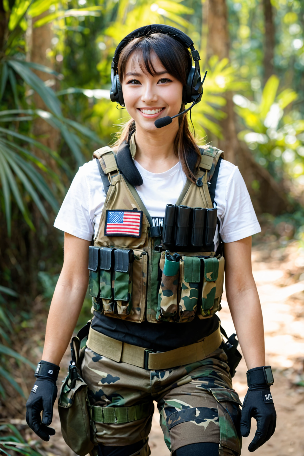 cinematic film still, realist detail, ue5,(masterpiece, best quality, ultra-detailed, best shadow),smile,posing for a picture,standing, gloves, military, headset,camouflage, load bearing vest, sling,wearing epTactical,plunging neckline,long hair,(jungle background),stockings, <lora:edgTacticalSDXL:1>