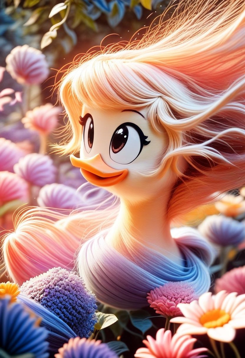 score_9, score_8_up, webby vanderquack, duck, among flowers, cozy, cute, extremely windy, wind swaying flowers, wind disheveling hair, 8k, hd, ral-clrflspr, photo, ElementWind
