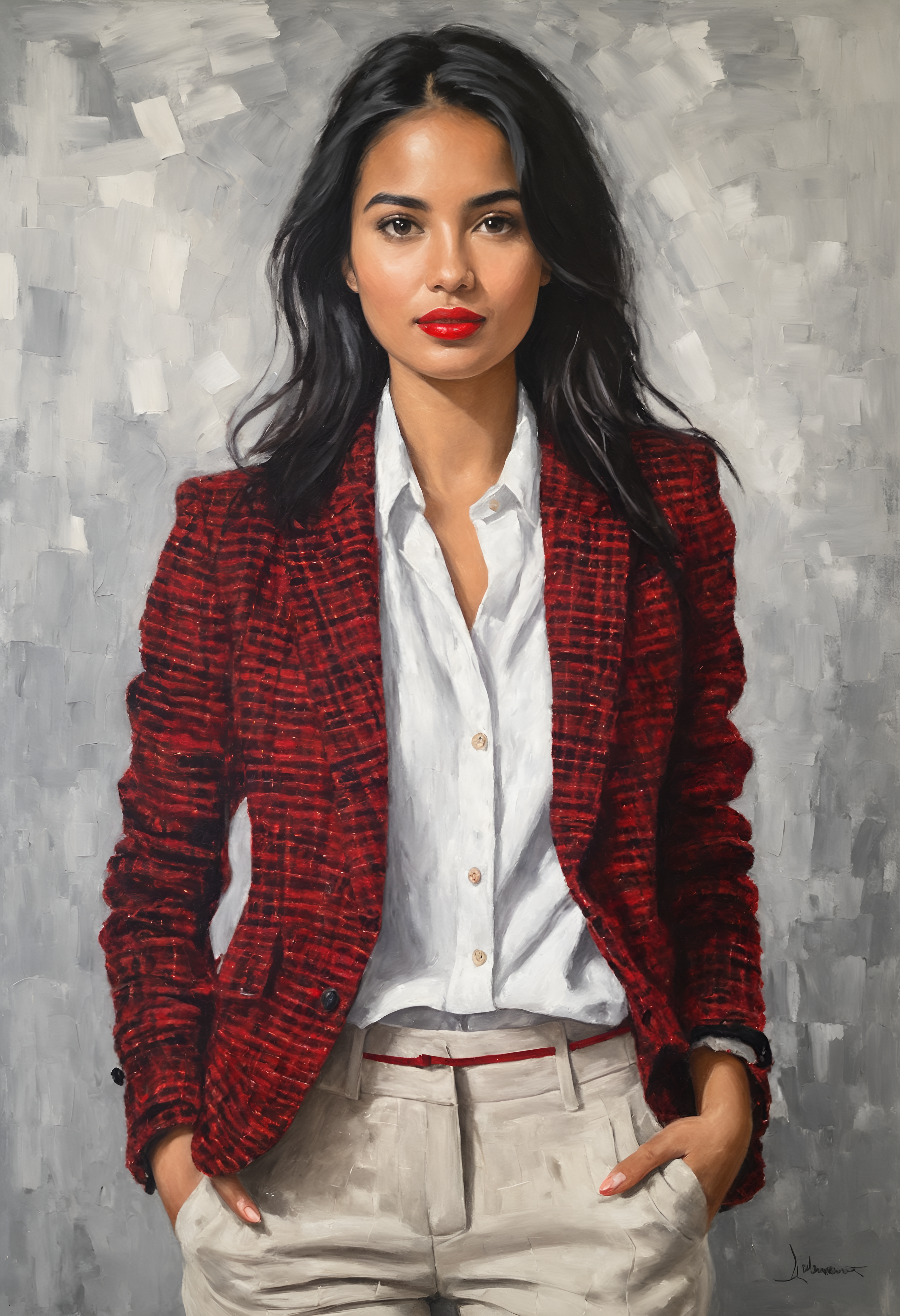 oil painting on canvas, portrait of beautiful 25yo woman, olive skin, wild black hair, tweed blazer, red shirt, white trousers, greyscale background, brushstrokes, textured oil paint, impressionist, impressionism