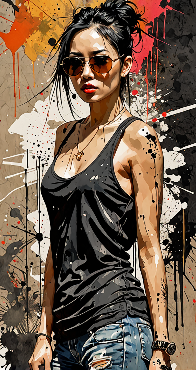 aesthetic, painterly style, modern ink, adult Asian girl, sensual, sultry, (punk retro ultra small hanging sunglasses), (dark blouse, tank top), expressive pose, urbanpunk, abstract texture multilayer background, vivid background, splash of paint, neo-expressionist, detailed background , Russ Mills, Ian Miller, urban, graffi, ,style of Anne Bachelier, <lora:add_detail:1>, halfbody portrait, frow below, cinematic, striking, posing