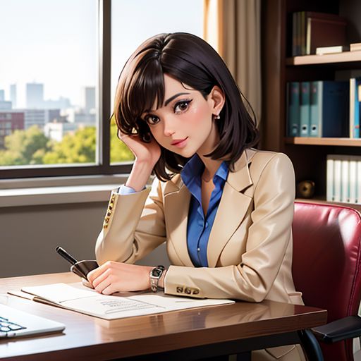 Andrea: a 50-year-old woman, 5'8", with a toned body and tanned complexion, sits at a desk in her office. She has dark brown, straight hair that falls gracefully past her shoulders, expressive brown eyes, a straight nose, and prominent cheekbones that enhance her soft facial features. Dressed in a tailored suit, she wears a classic blazer and a crisp blouse. Her jewelry includes pearl earrings, a slim gold bracelet, and a minimalist watch. The office setting features a modern desk, a computer, and neatly organized paperwork. Natural light streams through the windows, illuminating her sophisticated and professional demeanor.