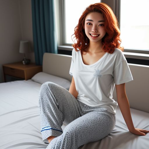 Caucasian, redhead, college girl, sitting on bed, sunlight coming from window behind her, loose t-shirt, pajama pants, smiling