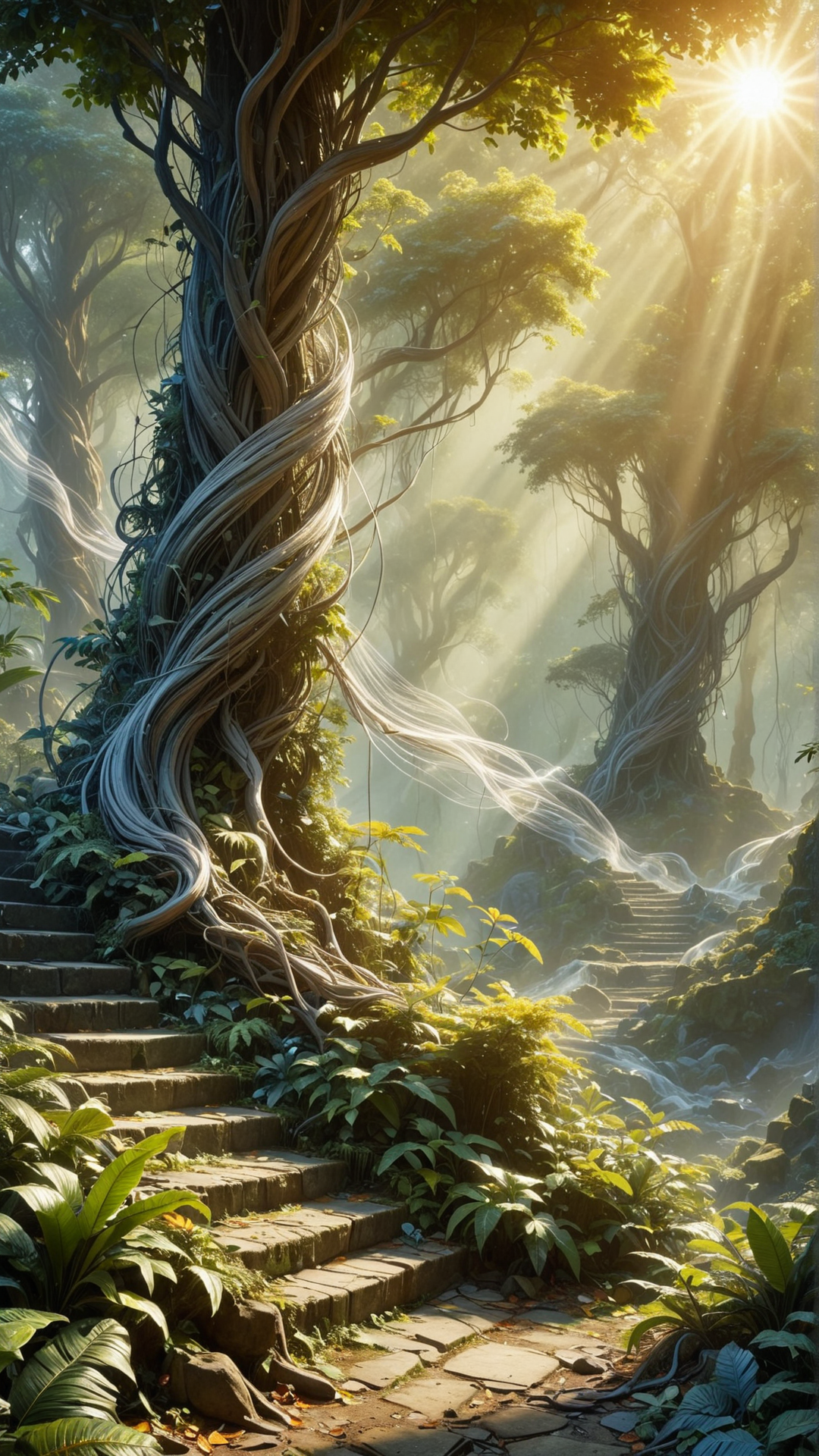 <lora:ElementWindSDXL:1>ElementWind Realistic oil painting of a lush, vibrant rainforest canopy, sunlight filtering through the leaves, misty atmosphere, a mysterious infinite staircase made of stone and vines, leading to nowhere, dense vegetation, intricate carvings on the stairs, ornate, ancient, serene, inviting, enchanting, magical, detailed, lush, luminous, rich colors, vibrant, vivid, lively, thriving, thriving ecosystem, lush greens, bright yellows, warm oranges, deep blues, intricate details, dramatic shadows, soft highlights, detailed textures, masterpiece, high-resolution, breathtaking, captivating, evocative, enchanting, inspiring, immersive, stunning, detailed, realistic, lifelike,a dirty sock wind, blowing ethereal streaks, gusts of wind, (Masterpiece:1.3) (best quality:1.2) (high quality:1.1)