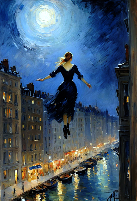 impressionist painting by Berthe Morisot, very rough painting with visible paint strokes, (dynamic_angle), woman flying between buildings, burning midnight costume, high boots, clothes like midnight full of stars, Night light, sharp shadows, moon lit, looking out over city, City landscape, dystopian city, crowds of people, standing high above stret, illustration,