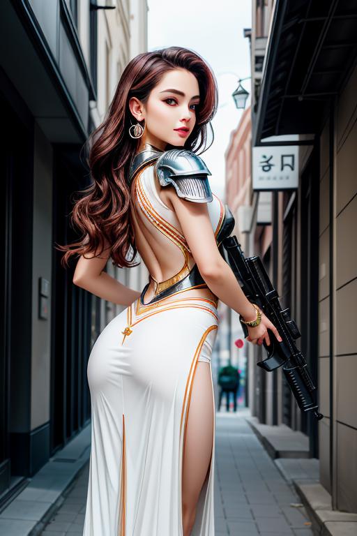 Portrait of a beautiful sexy girl standing with her back turned with a android body, battle armour, very sultry pose, lora:beautyMix_XL:1:1:lbw=Face, boots, full length photo, holding high energy weapon, Helmet newton inspired, cinematic, highly detailed, sharp focus, Dramatic Lighting, Depth of field, Incredibly high detailed, blurred background Jewelry includes pearl drop earrings, emphasising elegance, The lighting is soft and diffused, highlighting her features, Her pose is poised and graceful, with a slight turn towards the camera, EdobSyFyCityLandscape, highly detailed background:1.2 <lora:hyperdetailer_v095:1>
