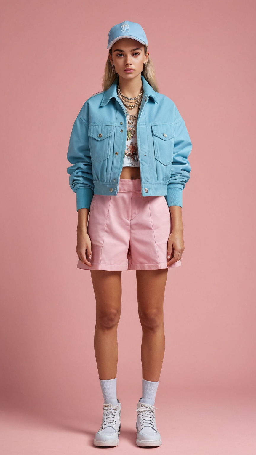 Create a hyper-realistic digital art collection featuring a young female model in groundbreaking fashion for the year 2025, inspired by current fashion influencers. The collection should showcase a range of styles from casual to avant-garde, influenced by the unique styles of Chiara Ferragni, Kendall Jenner, the Hadid sisters, Rihanna, A$AP Rocky, Kim Kardashian, Hailey Bieber, Harry Styles, Zendaya, and Tyler, the Creator. Focus on blending high fashion with streetwear, incorporating gender-fluid and vintage elements. Draw inspiration from fashion blogs and social media platforms like Instagram, TikTok, and YouTube. The collection should feature high-tech materials, sustainable fabrics, and smart designs that reflect a global influence. Use a bold and earthy color palette, and apply dynamic lighting to highlight the innovative and futuristic aspects of the designs. The resolution should be high to capture the intricate details of the fabrics and textures. Include a diverse range of models representing various ethnicities and backgrounds, showcasing a global, inclusive approach to fashion.