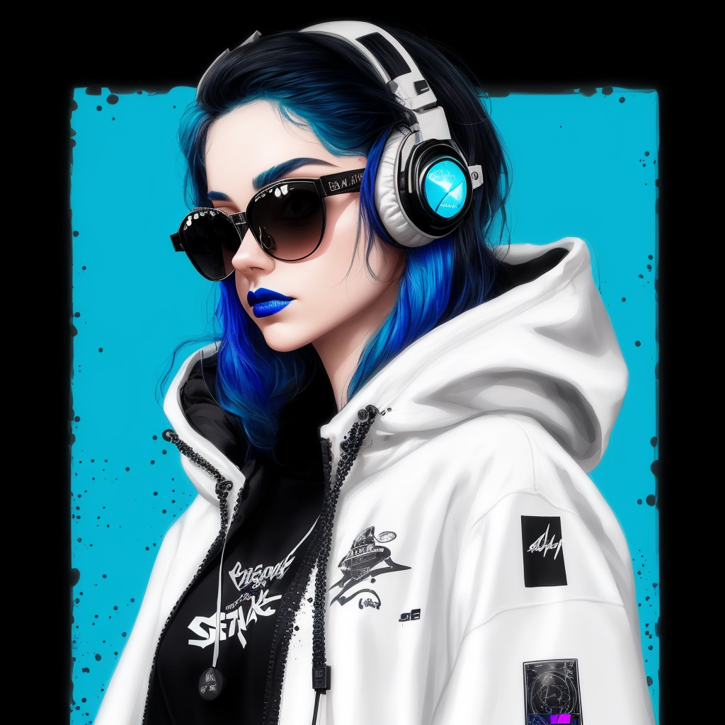 woman,blue hair,long hair,blue lipstick,(blue sunglasses), geometric sunglasses, latex,sexy,beautiful,masterpiece,extremely detailed,((black and blue background:1.1)),cyberpunk,splatter,white and black headphones,black cloak,modern,futuristic, robotic, hoodie, tech, technology, streetwear,full body, space