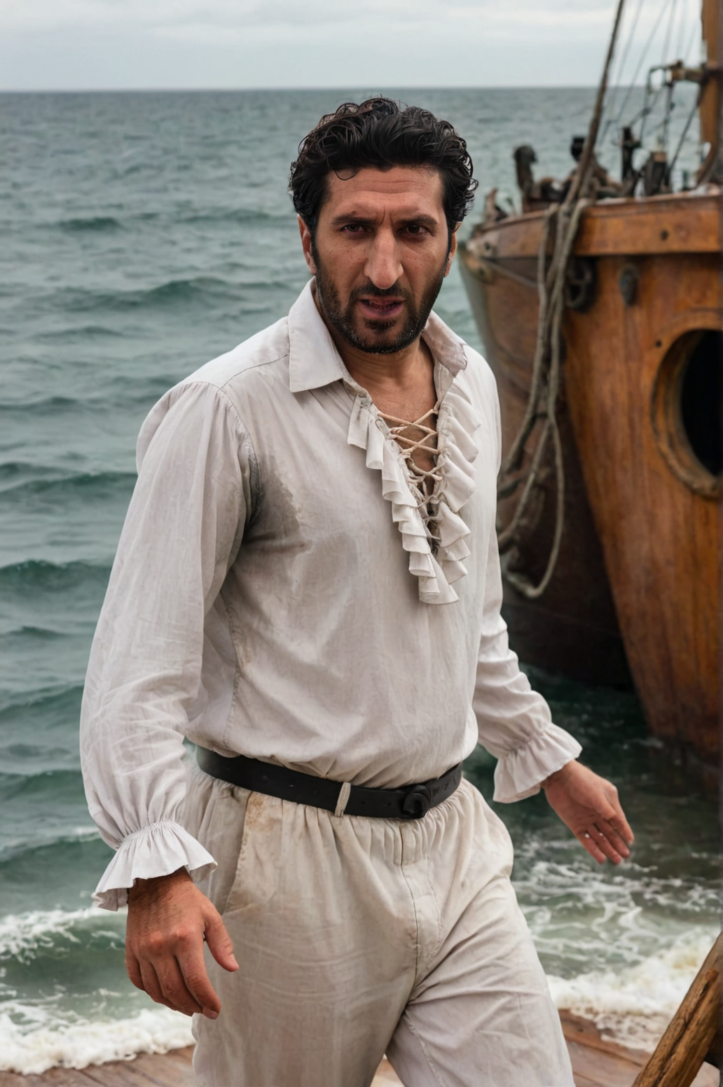 cinematic action full body photo of Fares Fares, age:50, wearing a prtshirt, white ruffle shirt, long sleeve, drawstring, male focus, holding onto the edge inside a ship, falling, running towards the camera, in a ship, wooden floor, natural lighting, 4k, high quality, Fujifilm XT3 BREAK A ship in the foreground is being attacked, wreaked by a orange-monster Kraken, wood, BREAK A (kraken:1.3) emerging from the open sea in the background, a orange-squid giant-monster, sea, waves, storm, shaky, natural lighting, 4k, high quality, Fujifilm XT3 <lora:PirateShirt-V3:1:lbw=1,0,0,0,0,0,1,1,1,0,0,1> <lora:Fares_Fares_v1b:0.8:lbw=1,1,1,1,1,1,1,1.1,0.75,0,0.15,0.8> <lora:sweaty_shirt_v5-28-B1-Rescale:1.15>, s3t on armpit