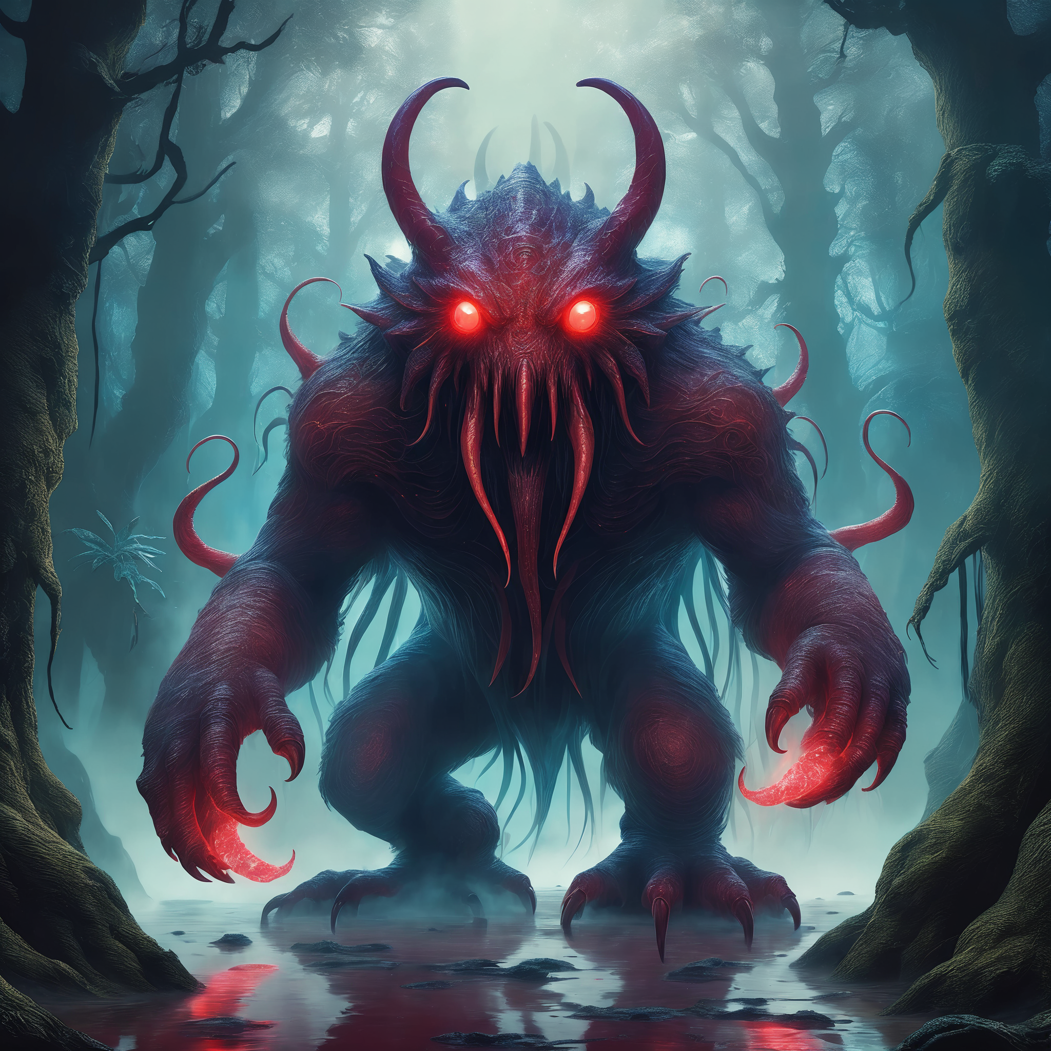 <lora:add-detail-xl:2.0>, <lora:style-beeple_mike_winkelmann-xl:1.4>, beeple (mike winkelmann) style, detailed expressive eyes, fantasy style, the mysterious feathered sanddemon, a worbleflanked monster ermerging from the depths of the misty dimensiflored swamps of planet krakenhome iv, shown here with its monkiflonged claws glistening in the moonlight as it glurfles, twisting trees and erbelforing the will-o'-the-wisps in its vicinity, maw, red (glowing eyes:1.4), dark claws (casting a swirling red energy magic spell:1.5), (volumetric fog covering the ground:1.2), vines, lichen, moss, dramatic background, extremely detailed