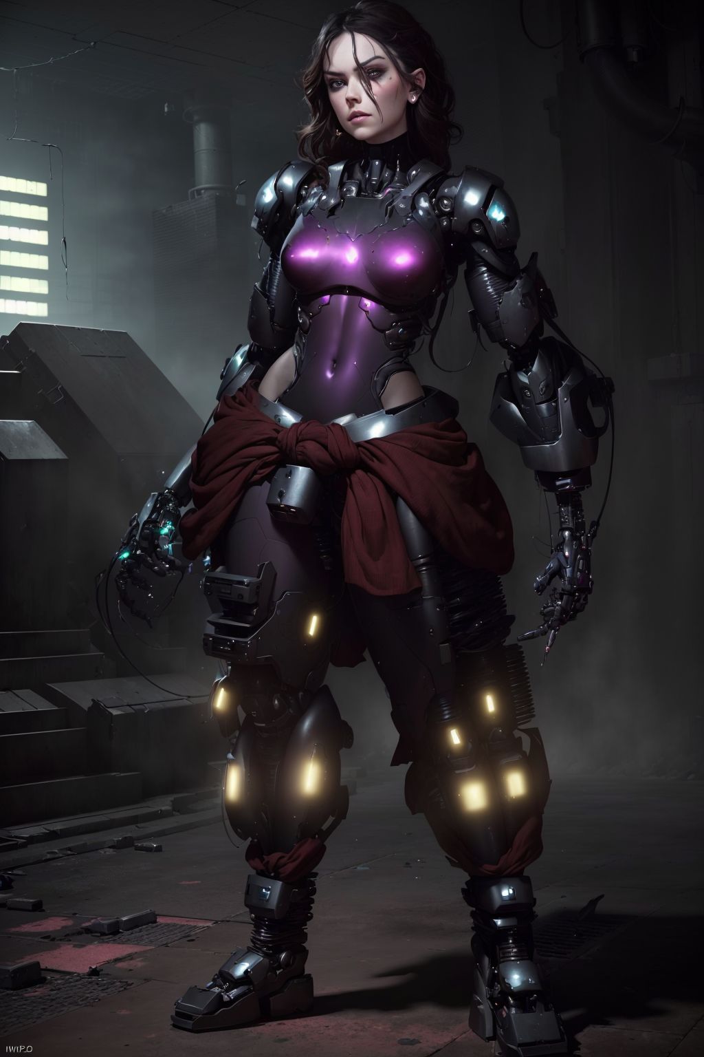 (full height digital image:1.3),(koh_daisyridley:1.3),(Masterpiece:1.5) In this evocative cyberpunk-style artwork, which combines the artistic styles of (Yoji Shinkawa:1.1), (Simon Stlenhag:1.1), and (Kekai Kotaki:1.1), a woman known as Glory from Shadowrun: Dragonfall is depicted in a hyper-detailed close-up portrait. Glory, a pale-skinned woman with an intensely striking face, is highlighted. Her sharp, fierce crimson eyes are akin to burning embers, locked in an unwavering gaze. Her long, black hair is slicked back, revealing her lightly-scarred (face and neck which are adorned with bulky, outdated cybernetic enhancements.:1.6) (These cybernetics, which include dataports and interface plugs, possess an industrial and archaic appearance, reminiscent of a bygone era of cyber technology.:1.6) (Emerging from her cybernetic arms and shoulders, we see razor-sharp blades that gleam menacingly:1.7). The blades, an integral part of her cybernetic arsenal, are retracted and ready for combat, and their edge is so sharp it seems they could cut through the very air. Her makeup is minimalistic yet striking; dark, (smoky eyeshadow evokes the shadows of a moonlit night, while eyeliner extends past her eyes in an edgy, winged design. Her lips are painted a near-black shade, creating a stark contrast against her ghostly complexion.:1.3) (Wrapped around her is a dark, ethereal energy that hints at the mystical, which is in stark contrast to the heavy, outdated cybernetics.:1.2) This shadowy energy and her cybernetic parts seem to be entwined, as if resonating with one another, suggesting a deep connection between her very essence and the machinery. Behind Glory, the neon-lit ambiance of a cyberpunk cityscape comes to life. The kaleidoscope of blues, pinks, and purples from the neon signs softly illuminate her face, and the cinematic lighting creates a dramatic interplay of light and shadow. The artwork paints the portrait of a woman balanced between worlds - the organic and the cybernetic, the mystical and the technological. Glory s expression is one of stoic resolve, telling a story of experience, strength, and determination forged in the shadowy corners of a high-tech, mystical future