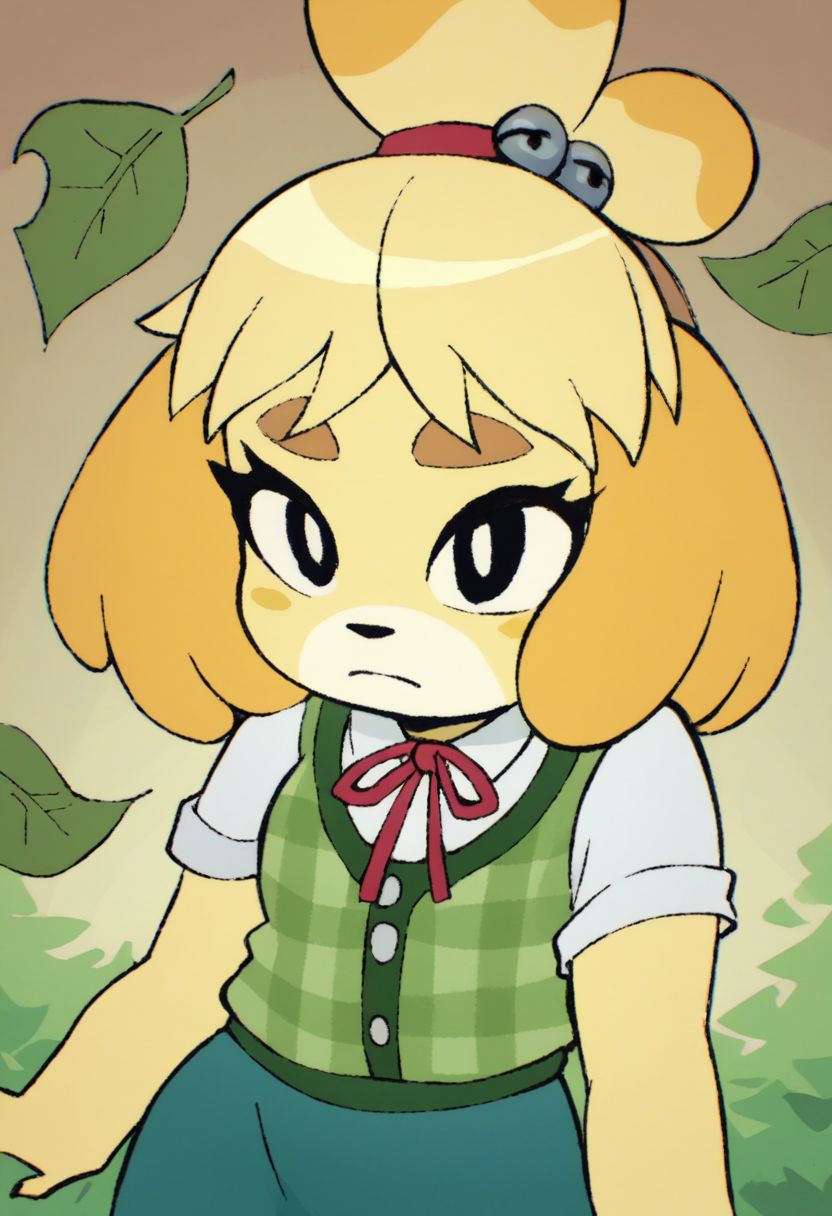 score_9, score_8_up, score_7_up, source_furry, isabelle \(animal crossing\), scttp, plaid vest, blue skirt, white undershirt, short sleeves, leaf pattern, button up, hair bell, jingle bell, hair ornament, hair tie, neck ribbon