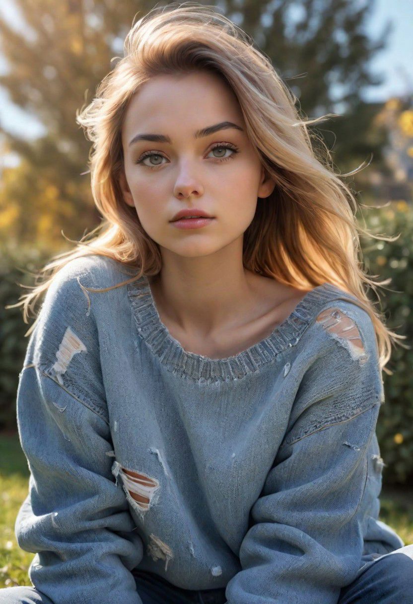 RAW Photo, Seen from a distance, wearing distressed jeans and a heavy sweater, masterpiece, ((Real Life Like Image)), best quality, highest quality, volumetric lighting, sunny day, focused, extremely detailed face, real face, ultra realistic, absurd-res, HDR:1.2, highly detail, (Crystal Clear), <lora:more_details:0.6> epiCRealism, <lora:Margo_Harshman_V3:0.75>