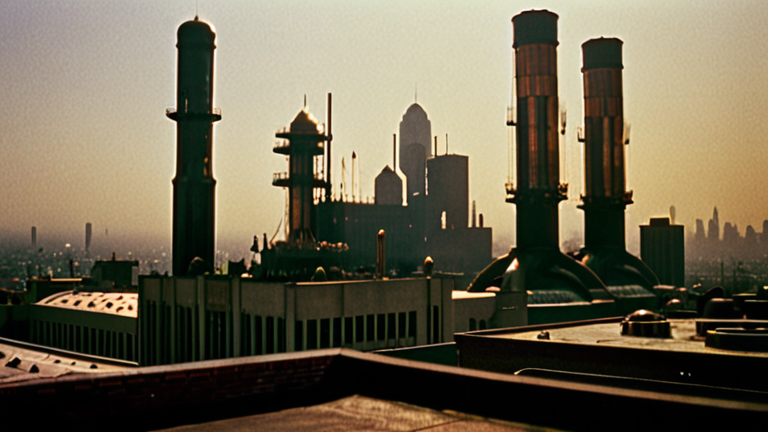 Cinematic wide-angle photograph of Blade Runner Movie Los Angeles, the Tyrell Corporation center amongst the surrounding city-scape, Architecture is heavily influenced by Victorian-era Steampunk, Brick and brass are prominent on all buildings, White steam emits from building rooftop chimneys and tall brass rimmed brick smokestacks, A light steam haze is throughout the city, The twilight hour fills the scene with gold and copper hues, carriages are afloat held by roped mini-zeppelins,