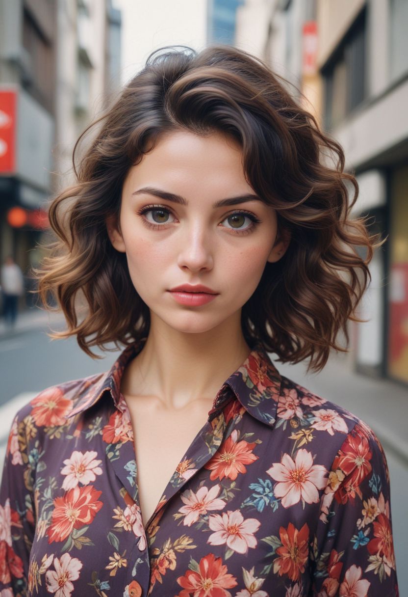 Photo of a modern Caucasian European woman with wavy dark hair, detailed brown eyes, and a floral shirt on Tokyo street, Portra 400