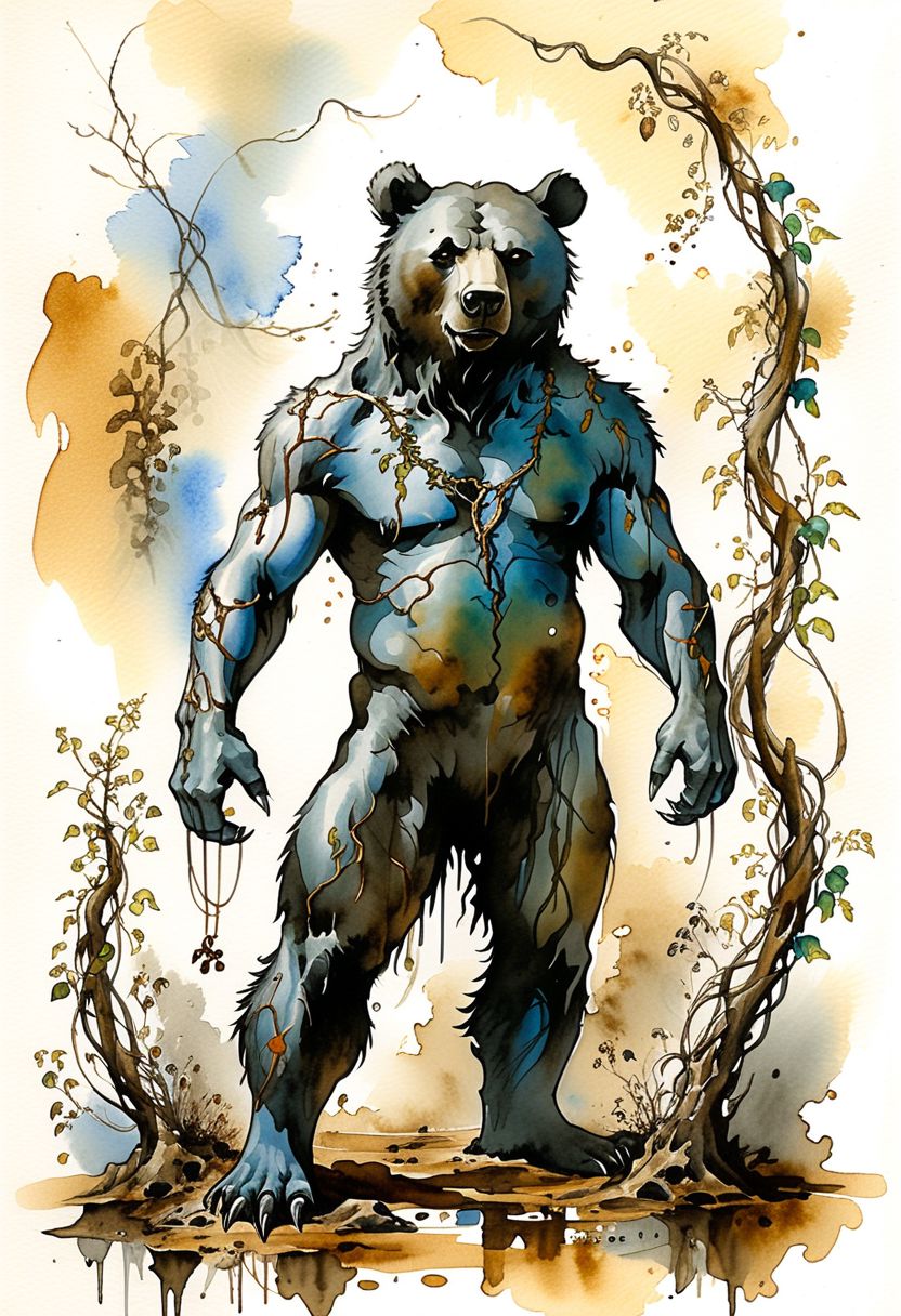 watercolor illustration, ((art by Boris Vallejo)) , Full body, bear earth elemental, binded by vines, enslaved, flowing vines, glowing runes, earth and mud), old style ink illustration, on parchment, ink splashes, ink stains, ink smears, faded ink,