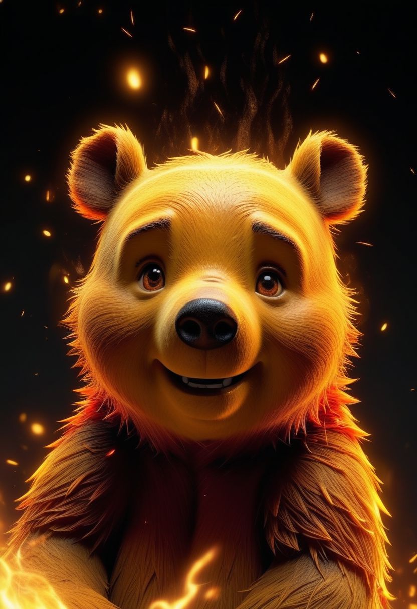 (Envision Pooh the Bear, the beloved character from the Hundred Acre Wood, transformed into a majestic fire element. His fur is made of dancing flames, ranging from the deep red to the bright yellows n. Around him, sparks of ember float gently, as if he’s surrounded by a halo of fireflies. His eyes gleam red, amber glow, reflecting the power of fire. looking angry), glowing, fire, fire element, intricate details, semi realism ,semi realistic, Perfect lightning, firefly, fire background,