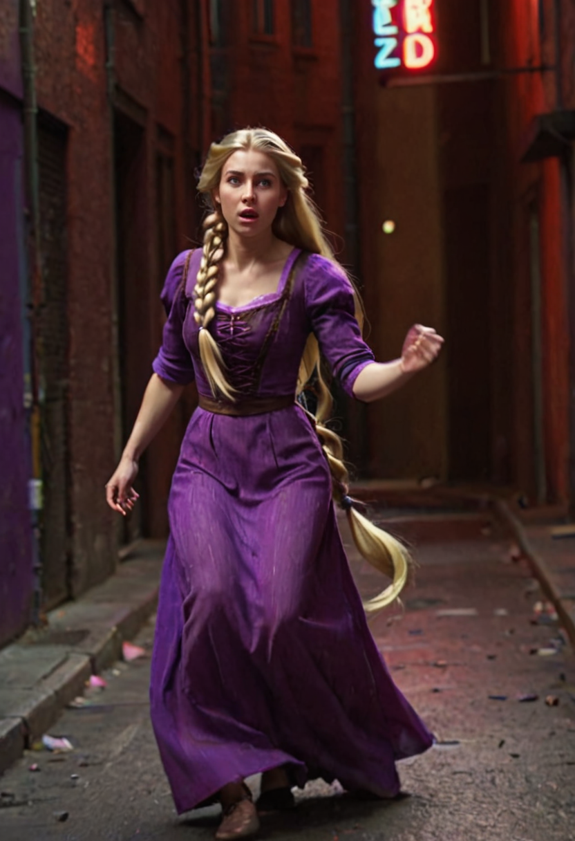 <lora:Char_ram-KungFuryArcadeMachine:1.0> woman, rapunzel, very long blonde braid, purple:1.2 dress, english fashion, angry, action shot, (chromatic aberration), neon alley, [film grain], motion blur
