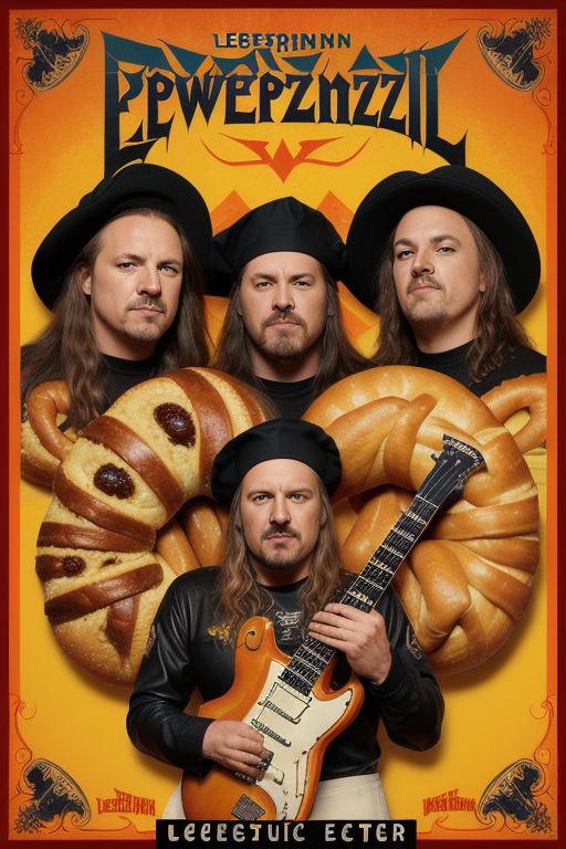 (awesome powermetal album cover, powermetal band poster, (LeistungBrezel):1.3), metallica, sabaton, rammstein, poster, bakery, (electric guitar with the texture of a big soft pretzel:1.3), chef hat, medieval town background, detailed face