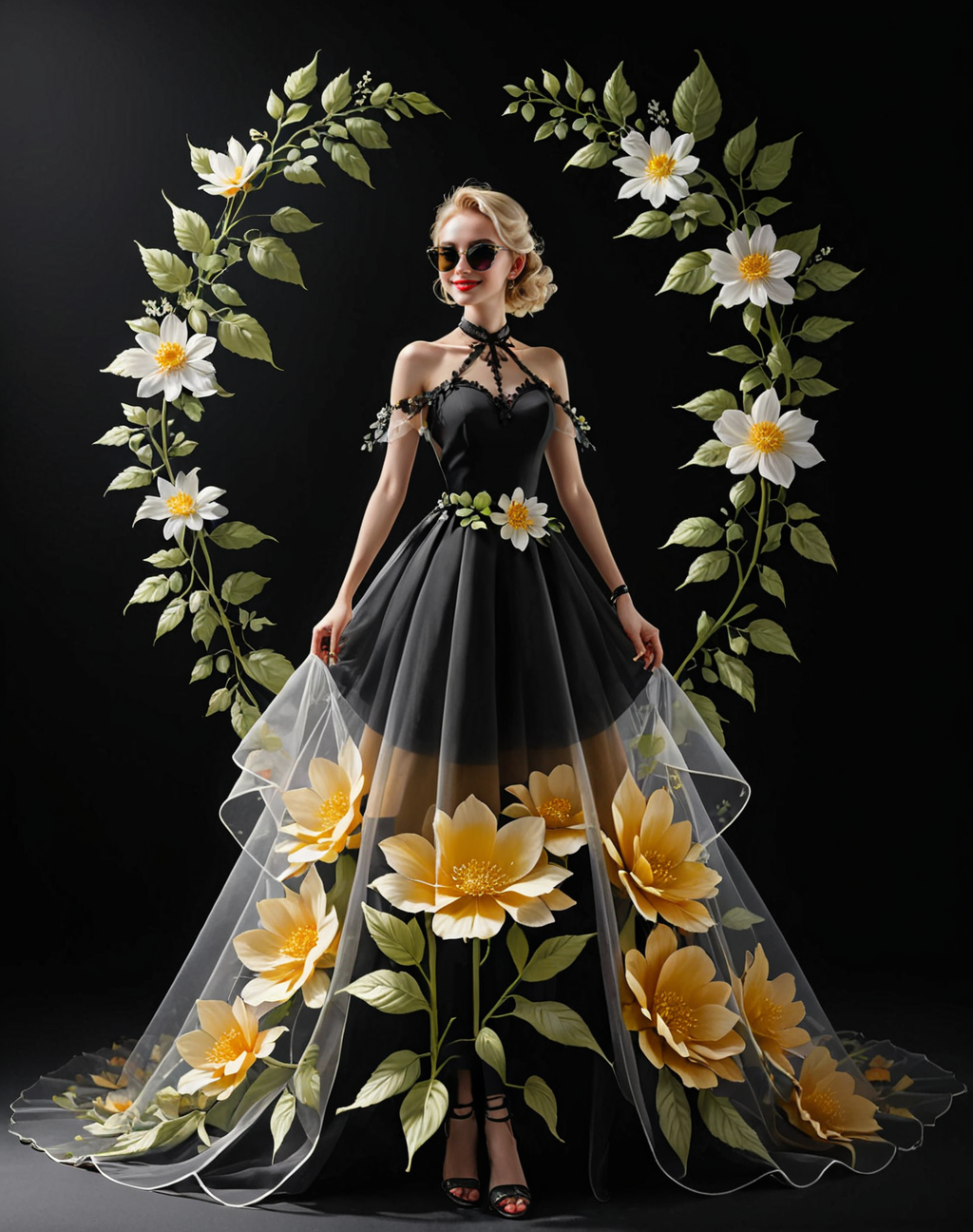 cinematic film still, realist detail, brooding mood, ue5,(masterpiece, best quality, ultra-detailed, best shadow),smile,posing for a picture,standing,1girl,solo,smile,blonde woman,sunglasses,choker edgTF, simple background, full body, flower, see-through, petals, plant, black background, veil ,wearing edgTF_dress <lora:edgFantasySDXL:0.85>