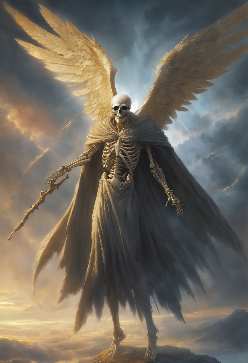 Well lit skeletal figure in nothing but black robes and gray angle wings on his back. flying down from the heavens being death himself.welding an classic farm scythe in his right hand with a wooden handle.. He has gray angle wings. He is reaching towards the camera with an open hand as godrays fill the gray bright cloudy sky behind him. White Feathers falling all around him. He is floating. Hand reached towards the camera. Golden sunlight depends upon the figure casting a beautiful arry of God rays. Solo. A skeletal face visible under the hood. Golden glowing white feathers falling across the sky. It's a beautiful enchanted shot depicting death claiming a soul. The figure is staring right at the camera. As the gray sky is pierced by the golden light of the god rays. Halloween angle.