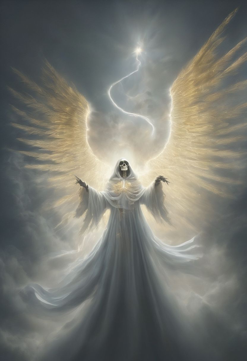 Well lit skeletal figure in nothing but black full body long sleeve robes and gray angel wings on his back. flying down from the heavens being death himself. Wielding an classic farm scythe in his right hand with a wooden handle.. He has gray angle wings. He is reaching towards the camera with an open hand as god rays fill the gray bright cloudy sky behind him. White Feathers falling all around him. He is floating. Hand reached towards the camera. Golden sunlight depends upon the figure casting a beautiful array of God rays. Solo. A skeletal face visible under the hood. Golden glowing white feathers falling across the sky. It's a beautiful enchanted shot depicting death claiming a soul. The figure is staring right at the camera. As the gray sky is pierced by the golden light of the god rays. Halloween angle. high quality. realistic 8k. best definition. angle focused. angel wings on back. alone. coming down from the sky.