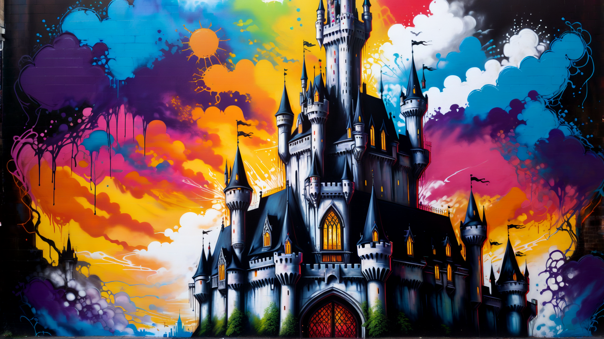 Graffiti style gothic castle, epic painting . Street art, vibrant, urban, detailed, tag, mural <lora:add-detail-xl:1> <lora:xl_more_art-full_v1:1>