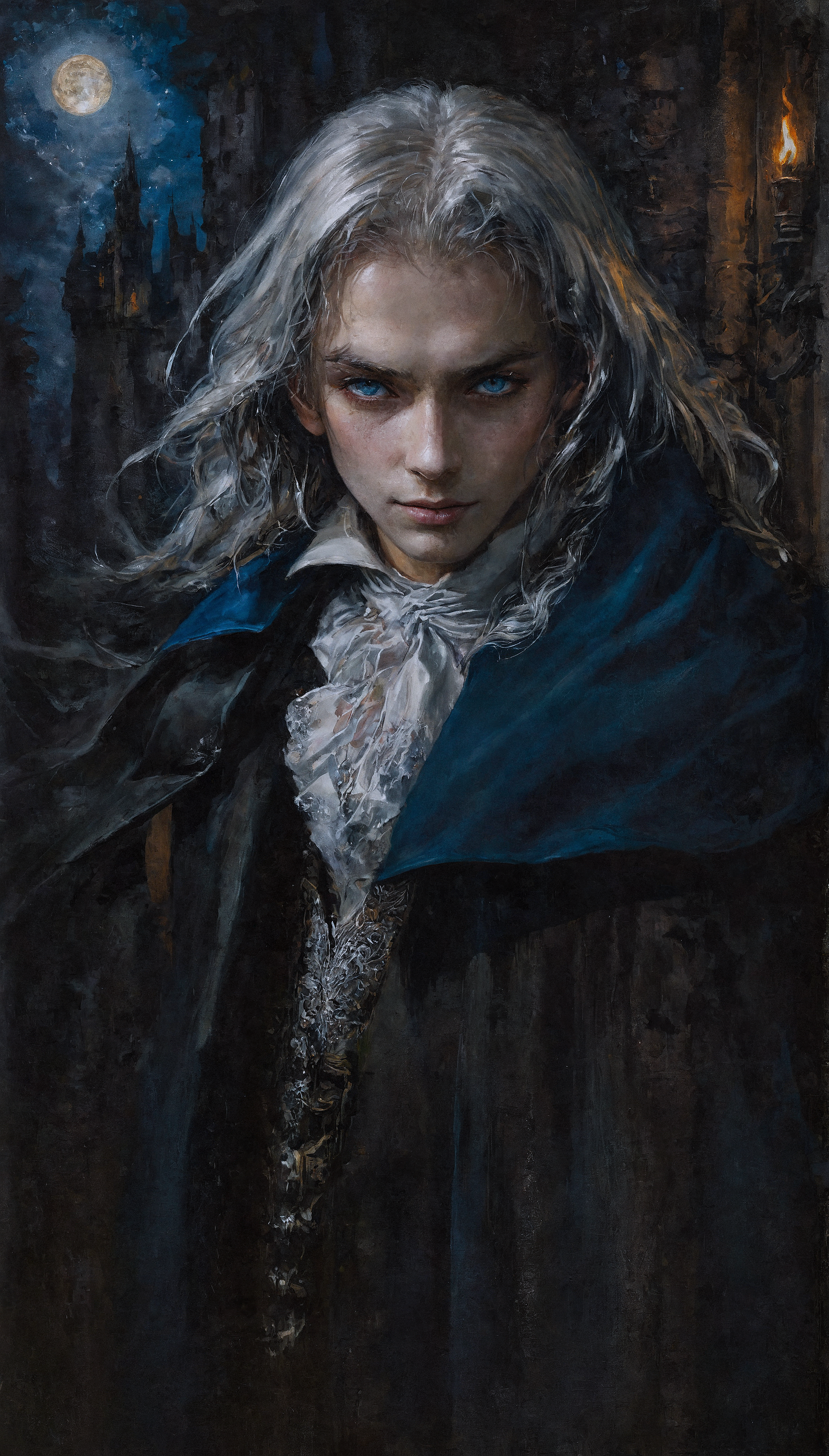 1boy, alucard \(castlevania\), grisaille, silver hair, black cape, white jabot, long silver hair, male focus, blue eyes, oil painting \(medium\), oil painting, impasto, chiaroscuro, scumbling, alla prima, underpainting, very aesthetic, highres, 4k, 8k, intricate detail, cinematic lighting, amazing quality, amazing shading, extremely detailed eyes and face, beautiful detailed eyes, on the steps of Draculas castle, full body, official art, key art <lora:add-detail-xl:1.5>, <lora:aesthetic_anime_v1sXL:1.0>, <lora:epi_noiseoffset2:1.0>, <lora:extremely_detailedXL:2.0>, <lora:Dark_NovelXL:0.30>, <lora:sd_xl_dpo_lora_v1:0.4>, <lora:EnvyBetterHiresFixXL01:0.2>, <lora:EnvyLiminalXL01:0.5>, <lora:EnvyAwesomizeXL01:0.5>, <lora:RMSDXL_Creative:1.0>, <lora:RMSDXL_Darkness_Cinema:1.0>, <lora:RMSDXL_Enhance:0.5>, <lora:AnalogRedmondV2-Analog-AnalogRedmAF:0.4>,