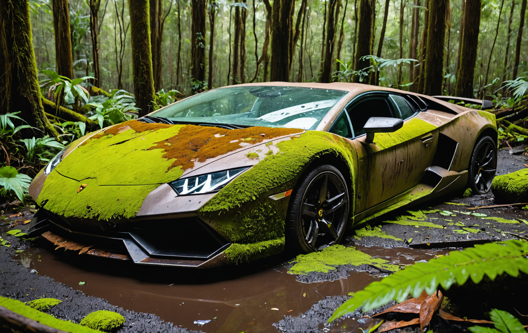 half submerged wreck of a 2019 lamborghini covered in moss, dirt, rusted, dead jungle, creepy, ominous, shattered windshield