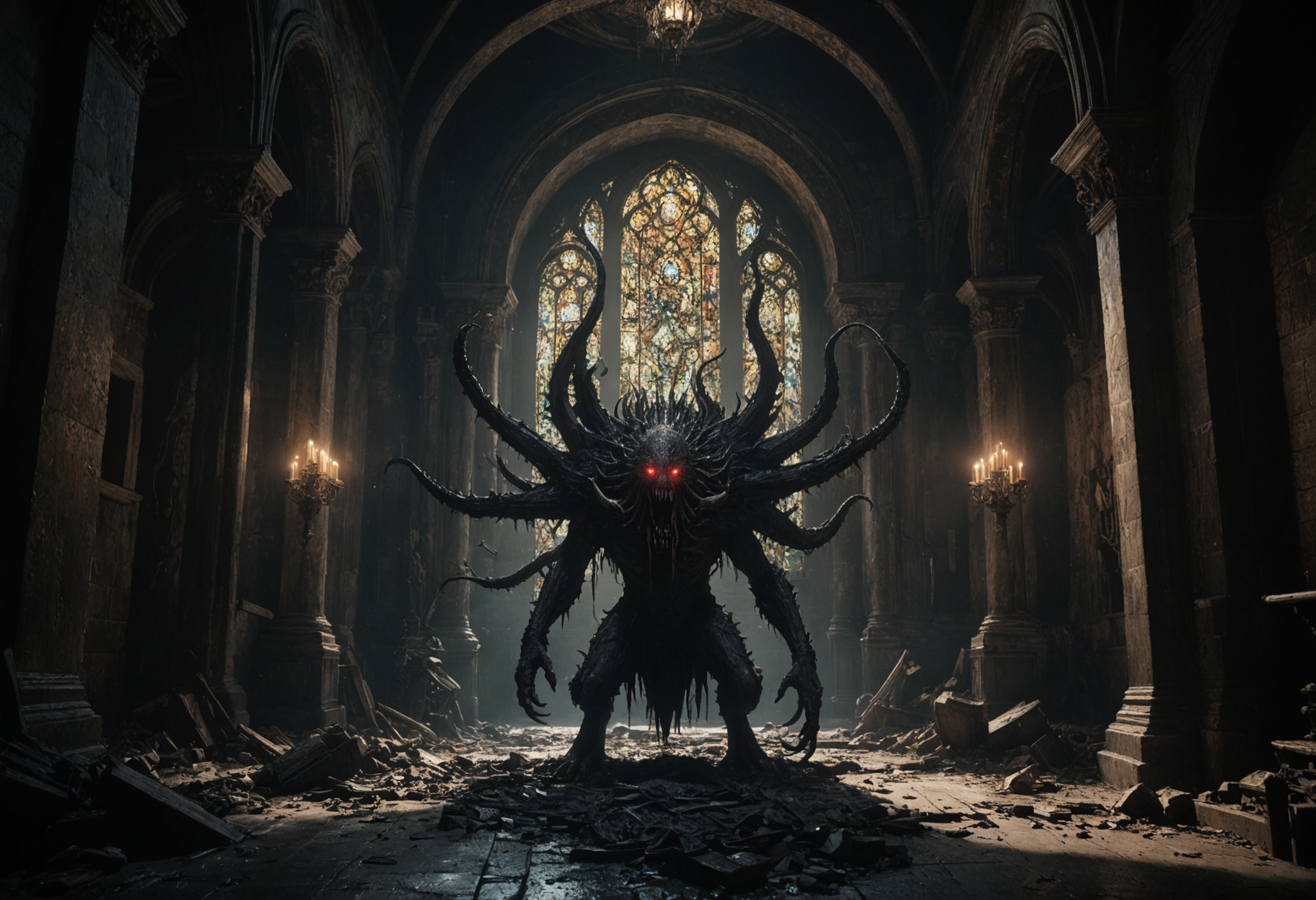 Terrifying and dramatic Bloodborne-style scene, featuring a monstrous, eldritch creature emerging from a swirling, dark vortex in a ruined cathedral; the creature's many eyes glow menacingly as it towers over a desperate hunter wielding a glowing, enchanted weapon, with broken stained glass windows casting eerie light patterns on the decaying walls, hyperrealistic, 32k, (((masterpiece))), (((ultimate quality))), exquisite gothic horror, highest texture resolution, photorealistic, epic composition, film grain, bokeh, soft focus, cinematic lighting, deep shadows, motion blur, intense and nightmarish atmosphere, SK_CINEMATIC, <lora:add-detail-xl:0.76>,