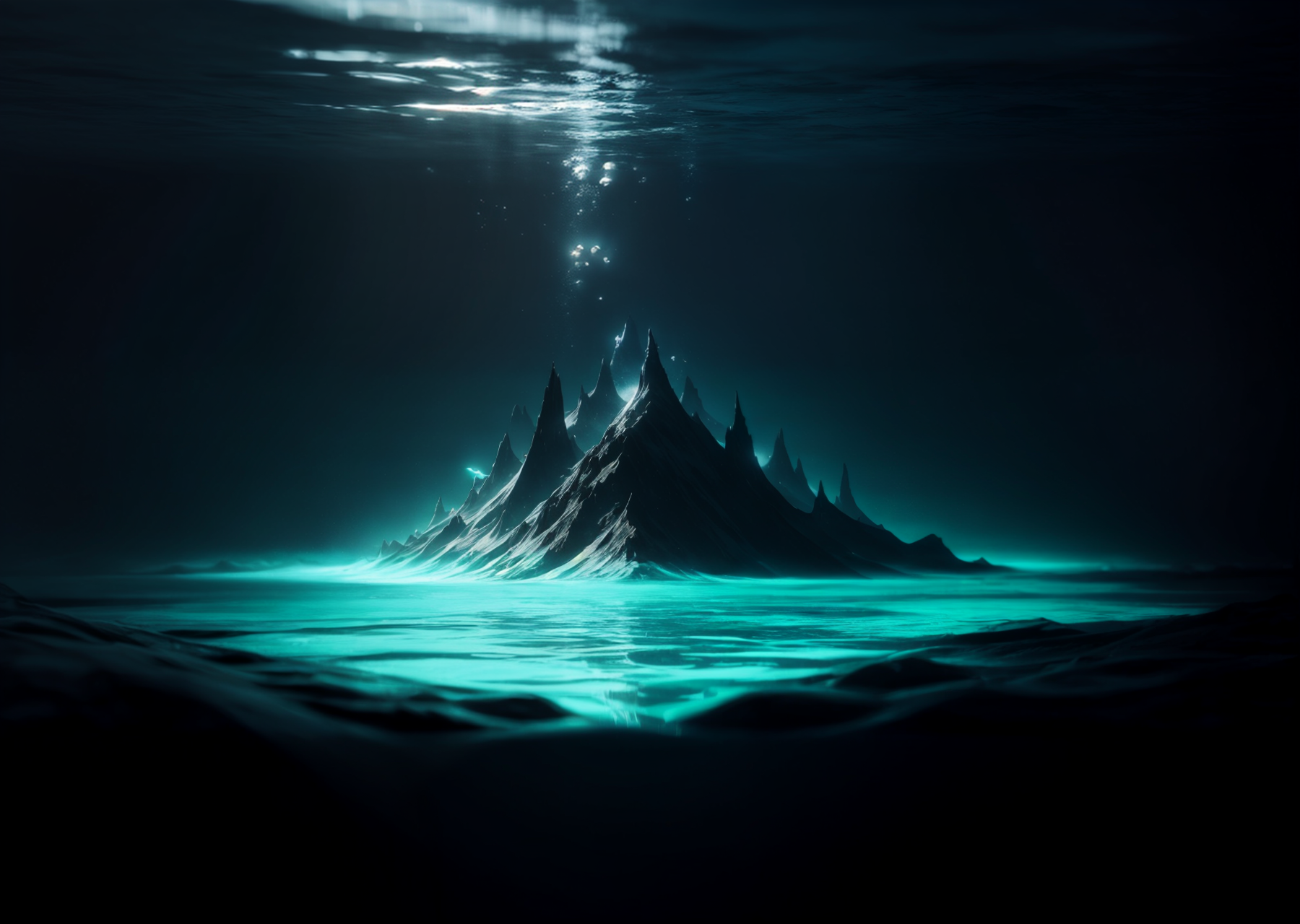[water droplet: underwater city:0.5],insanely detailed and intricate,godrays,ray traced reflections,floating in the air, glowing,black background,underwater mountains